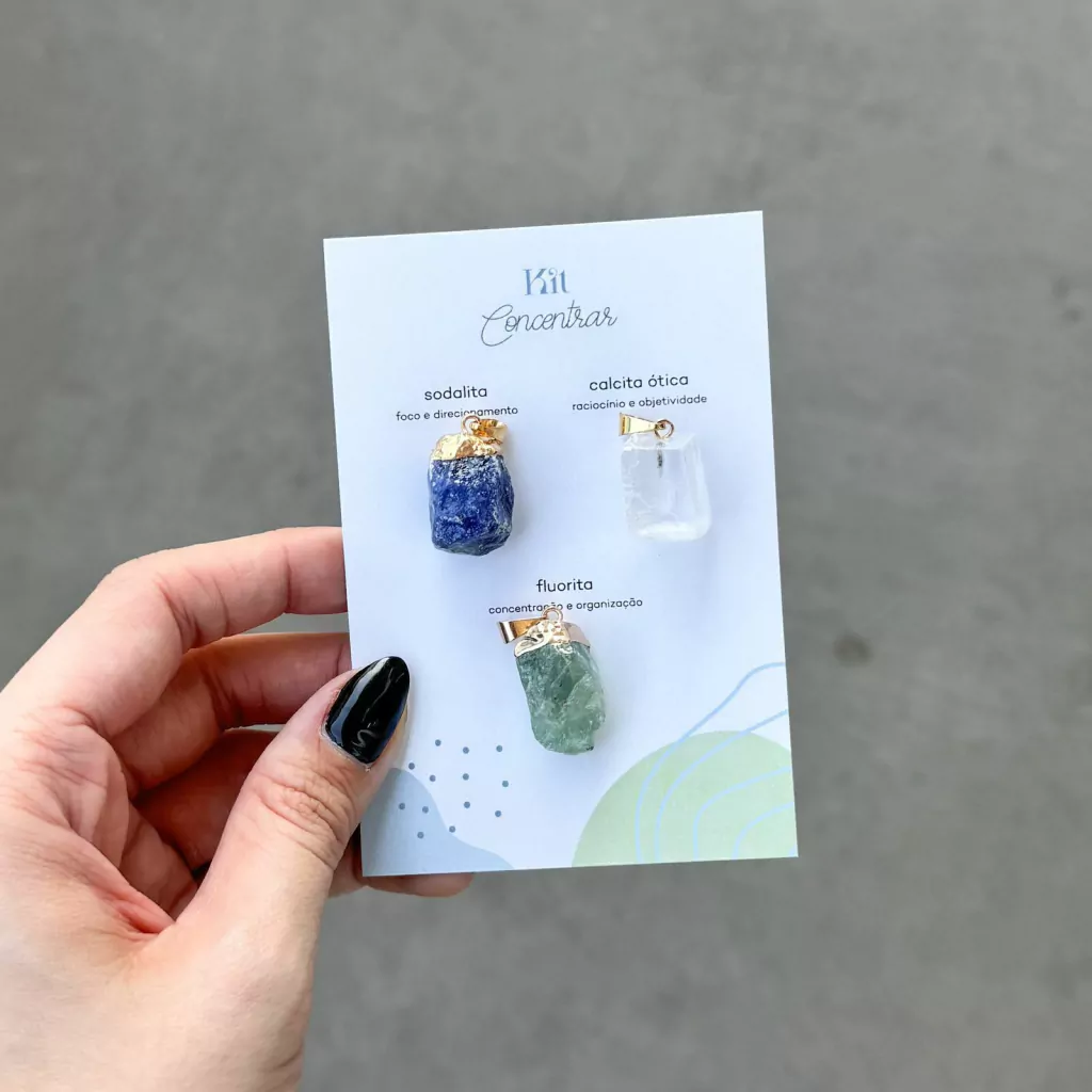 O kit Concentrar é composto por três pingentes: sodalita, calcita ótica e fluorita.