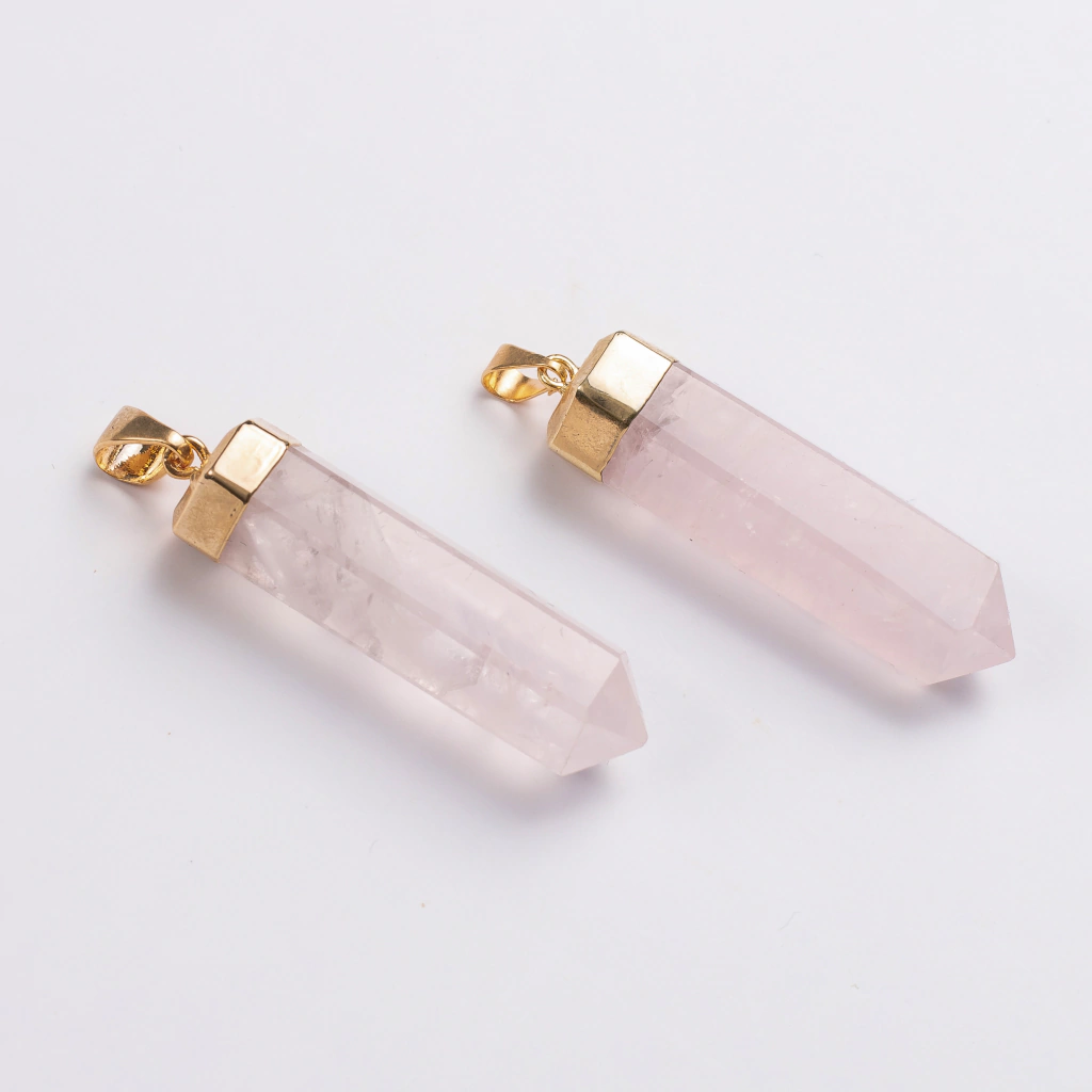 Pingente dourado de pedra natural quartzo rosa em formato biterminado.